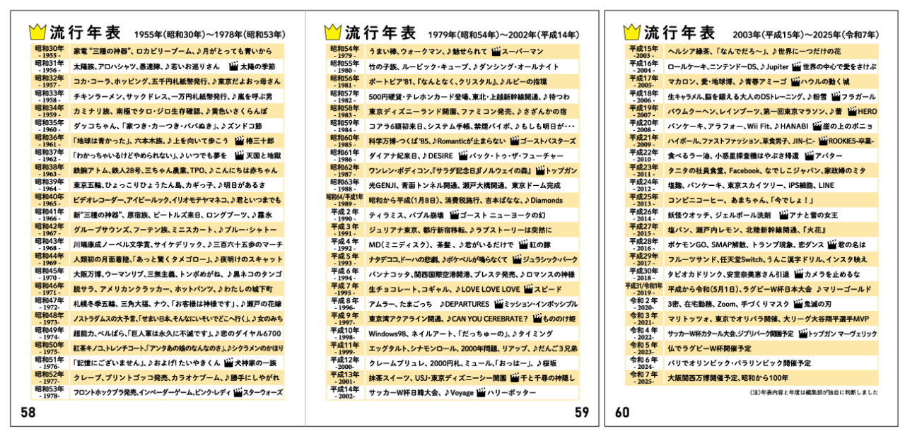 ベスト10ノートの最後の3頁(58ページ~60ページ)に「流行年表」を掲載しています。